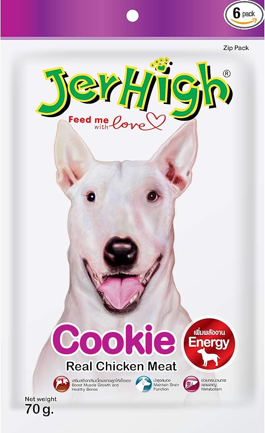 JerHigh Cookie is a premium snack filled with nutrients and vitamins to make your dog healthy and strong, with a tempting chicken flavor that your dog won’t be able to resist. It comes in the bite-size form of a cookie, great for all dog breeds. Nutritious and delicious, it’s the perfect treat to reward your special friend!JerHigh Cookie is made from real chicken meat and has been meticulously prepared by our highly experienced expert team. It has been researched and tested in the laboratory to ensure that the treat is hygienic, safe, and filled with all of the nutrients man’s best friend needs to stay healthy and happy. You can rest assured that JerHigh Cookie is the perfect reward that your favorite canine deserves.