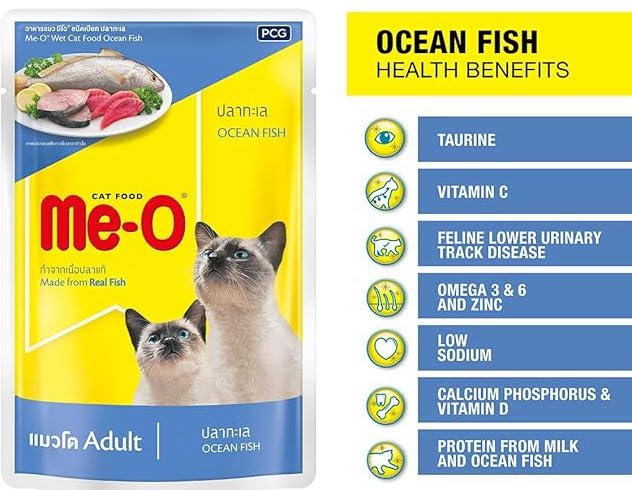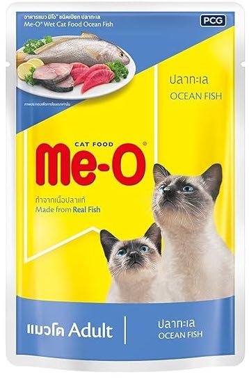 - MeO Ocean Fish Cat Wet Food is made of real ocean fish and supplies animal-based protein which is vital for the health of the cat. For an obligate carnivore, a protein derived from meat is a very important element to ensure an optimum health. Besides protein, the food also has vitamins and minerals for sustaining overall wellbeing of the cat.