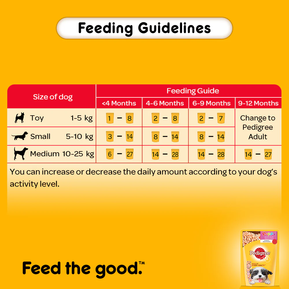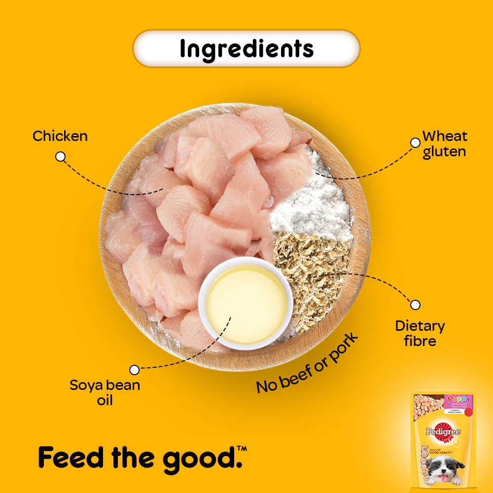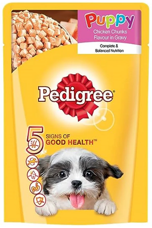• Pedigree Puppy Chicken Chunks Wet Puppy Food is a nutritious and balanced food for your growing puppy. Made with high-quality ingredients, Pedigree provides dogs with the 5 Signs of Good Health: Stronger Immune System Strong Muscles Supports Healthy Digestion Strong Bones & Teeth – Healthy Skin & Coat Pedigree Puppy Chicken Chunks Wet Puppy Food is a nutritious and balanced food for your pet dog. Made with high-quality ingredients,
