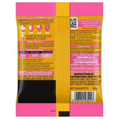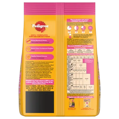 PEDIGREEĀ® Chicken & Milk for Puppy is a wholesome meal, packed with essential nutrients vital to the healthy growth of your pet. The natural goodness of cereals, chicken, meat, soybean, carrots, peas & milk blend into a tasty treat for your little one. Made with chicken, meat and vegetables, this recipe is rich in easily digested proteins and vitamins that help support a healthy skin and coat. Taurine, Vitamin E and other antioxidants boost your pup’s immune system. Calcium from milk helps strengthen your pup’s bones and teeth.