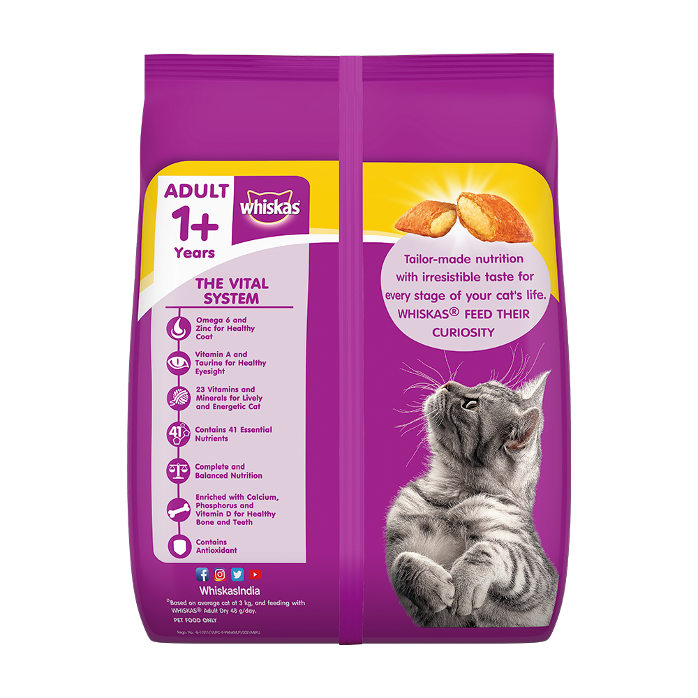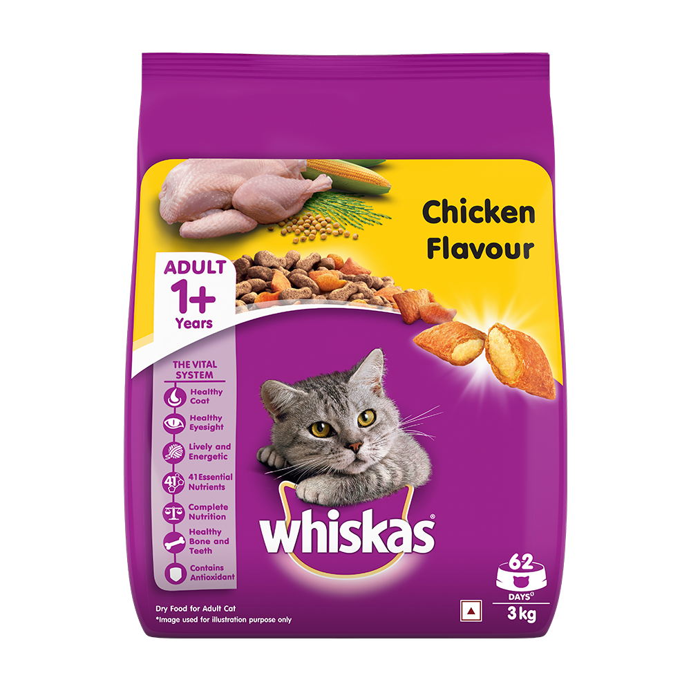WHISKAS® Chicken dry cat food is a nutritionally complete and balanced recipe that has carefully been created to cater to the requirements of an adult cat’s system. Flavorful chunks, with not only the best chicken and other poultry ingredients but also loads of other essential nutrients that will help your cat lead a healthy, active and long life.
