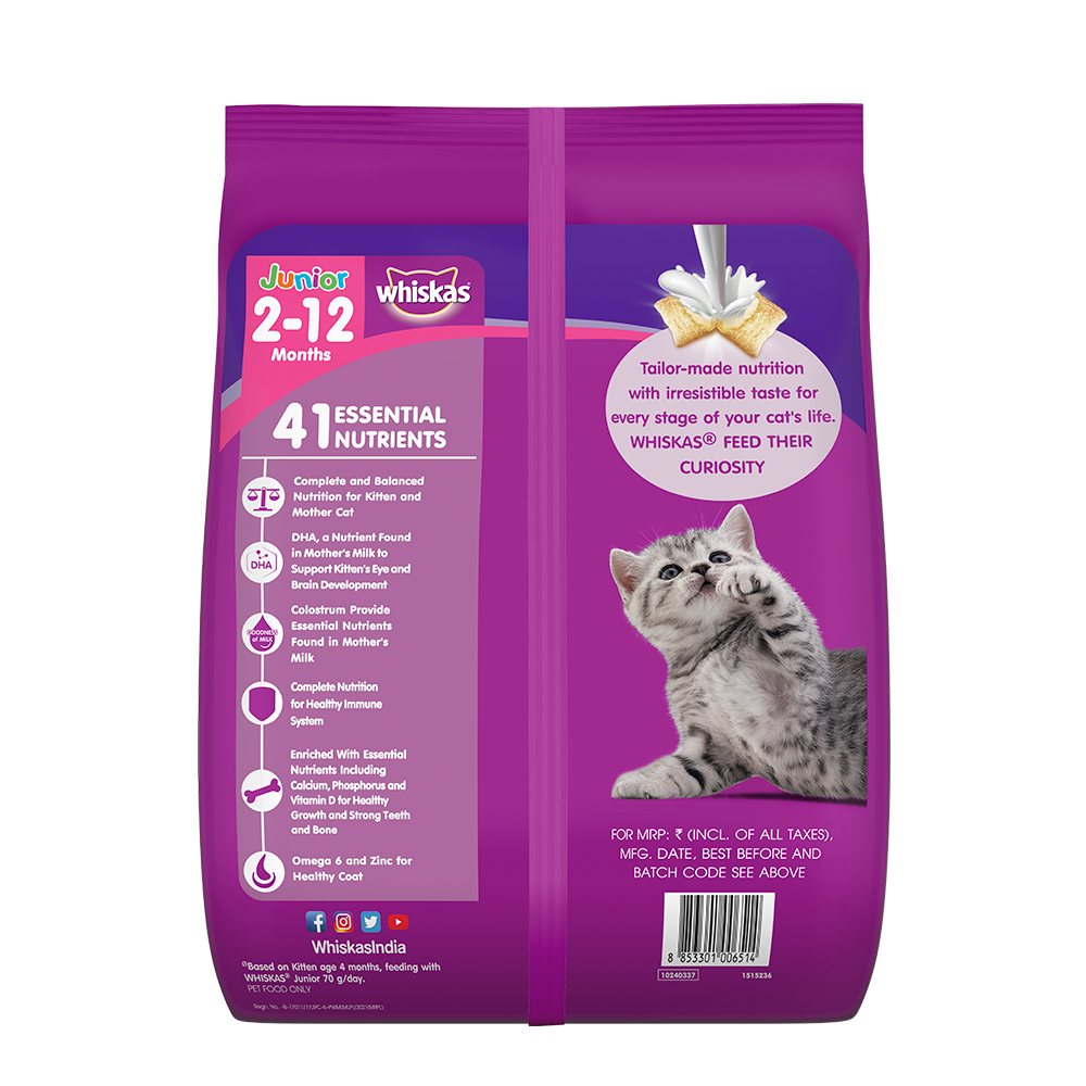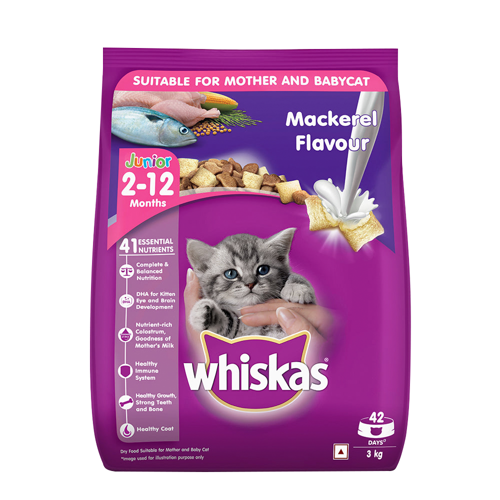 WHISKAS® Mackerel Kitten Dry Food is a nutritionally complete and balanced kitten food recipe that has carefully been created to cater to the requirements of an adult cat’s system. Flavorful pockets, filled with not only the best mackerel and poultry ingredients but also loads of other essential nutrients that will help your cat lead a healthy, active, and long life.